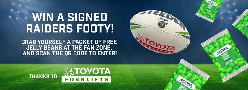 Thanks to Toyota Forklifts, we’re giving one lucky fan the chance to win a signed Raiders footy at each NRL Home Game!