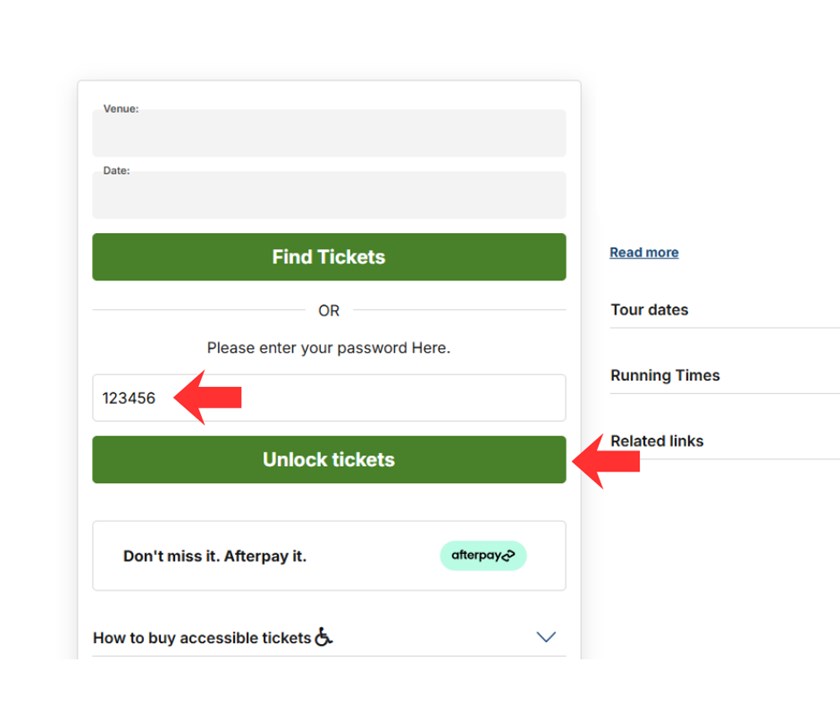 3. Once you enter your Account ID number in the password box on Ticketek, please click the 'Unlock Tickets' Button and follow the prompts to redeem your ticket(s).