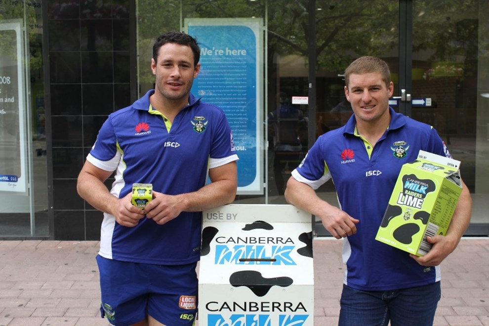 Glen Buttriss and Brett White draw out the lucky recipient of a Raiders Family Membership following Canberra Milk's 'Raiders Lime' promotion at the ActewAGL Royal Canberra Show.