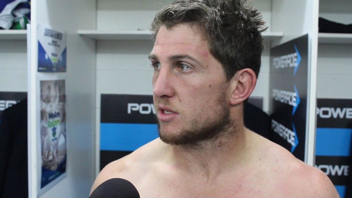 Second-rower Jarrad Kennedy speaks to Raiders TV in the dressing room following the 26-20 loss to the Penrith Panthers at GIO Stadium Canberra in Round 10.