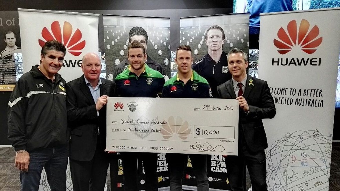 Today, Huawei Australia and the Canberra Raiders presented a $10000 cheque to Bowel Cancer Australia as part of the NRL Kick Bowel Cancer initiative in support of Bowel Cancer Australia Awareness Month in June.