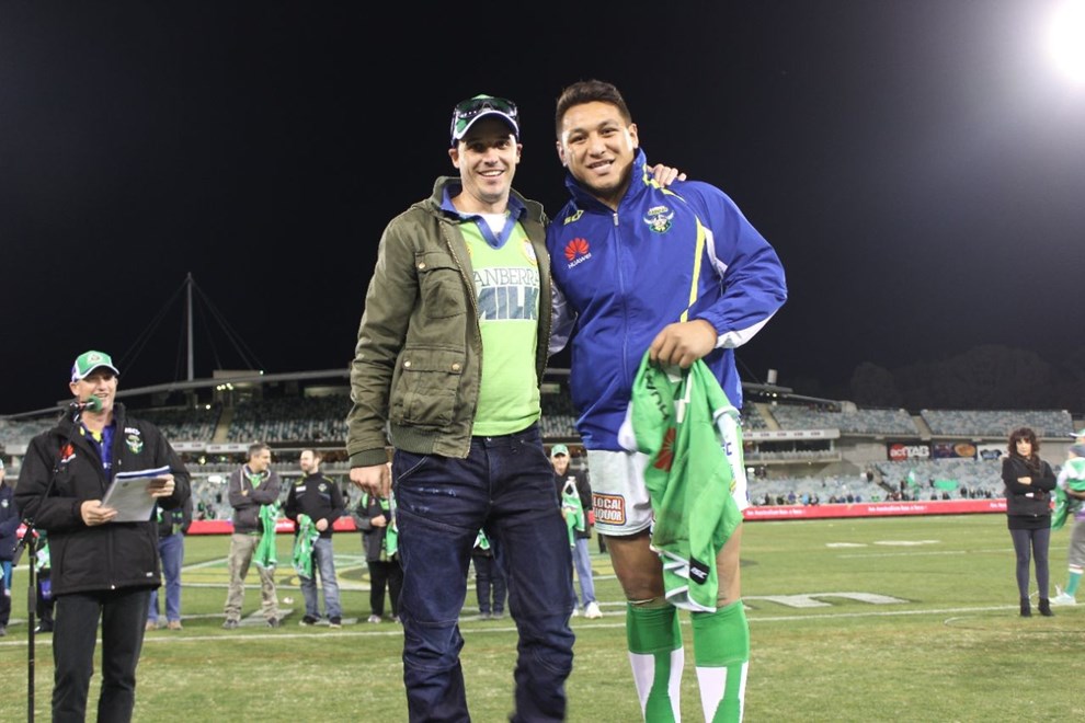 IMAGE: Josh Papalii presents a Raiders member with the jersey he wore in the final home match last season.