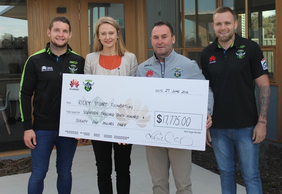 The Canberra Raiders and their Major Sponsor Huawei, handed over a cheque for $17,775 to the Ricky Stuart Foundation today, from the proceeds of a special jersey auction held earlier this season.
