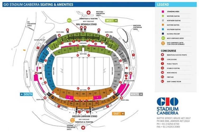 See the below map for a guide to the seating and amenities at GIO Stadium. Standing areas are highlighted in pink.