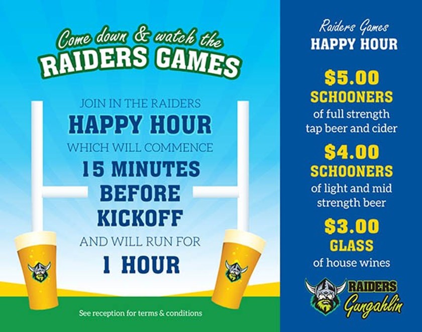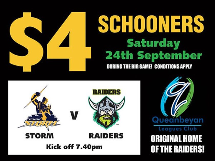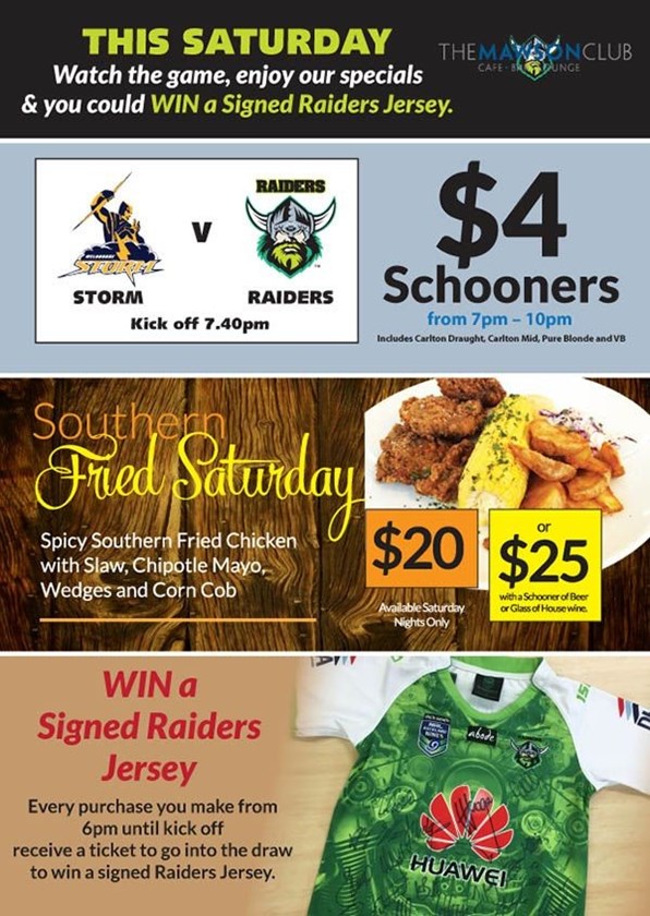 The Mawson Club will be offering $4 schooners from 7pm -10pm. Catch the game on the big screen and you can also win a Raiders signed jersey!