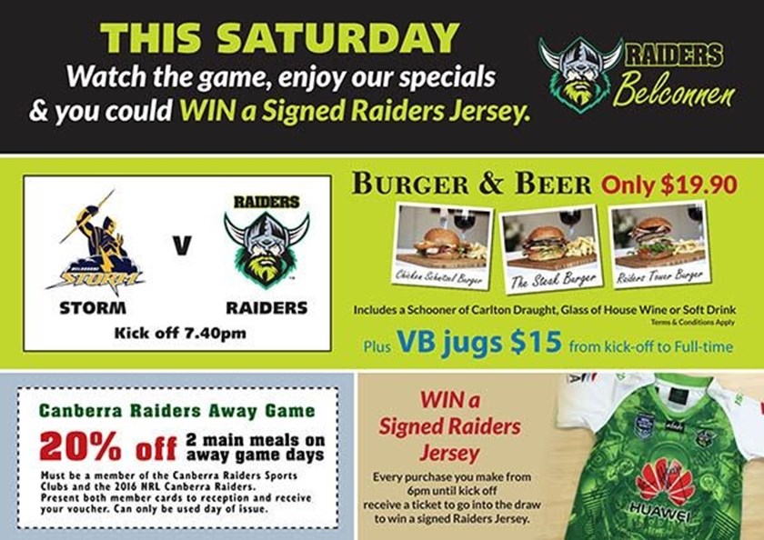Raiders members will receive 20% off 2 main meals upon presentation of their Raiders and Raiders Belconnen Membership cards at reception, while there will be a signed Raiders jersey given away on the night!