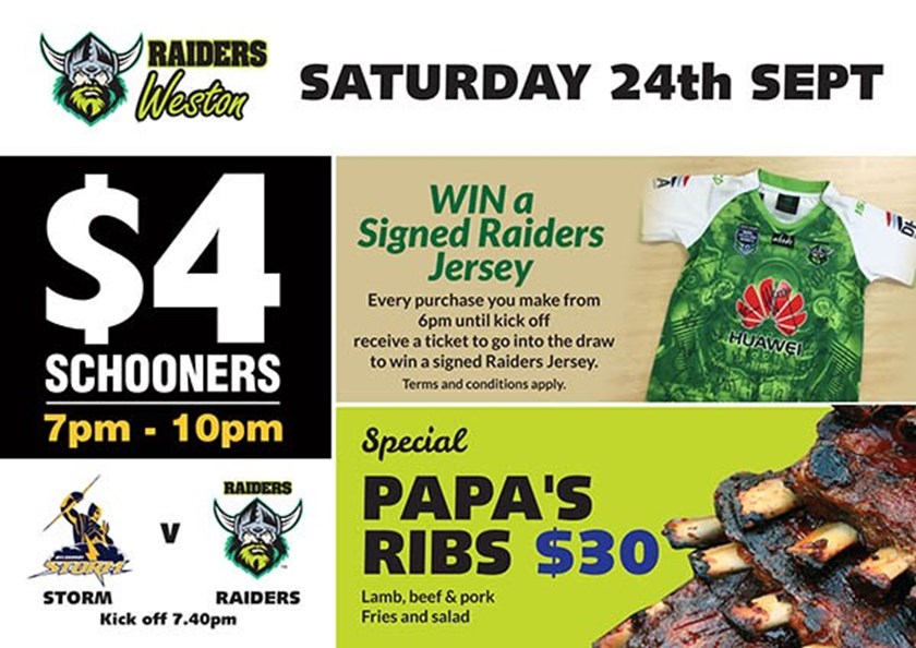 Raiders Weston will be offering a serve of Papa’s Ribs (Lamb, Beef or Pork) for $30 which includes fries and salad. There will also be $4 schooners from 7pm-10pm (Conditions apply), while there will be a signed Raiders jersey given away on the night!