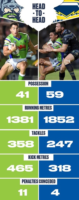 The Cowboys dominated the possession 59 to 41 per cent, while they also recorded 1852 metres to the Raiders’ 1381.