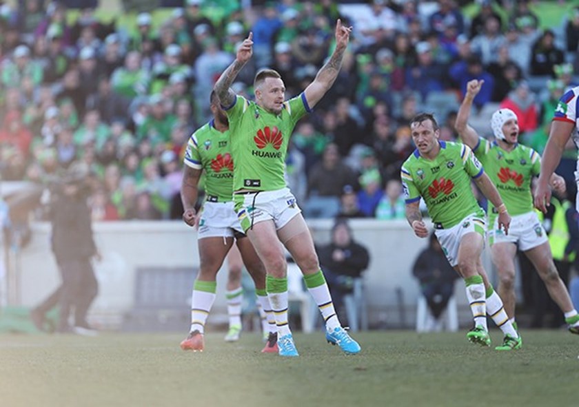 A few months later the pair met once again and sent a big crowd at GIO Stadium into a frenzy with an exhilarating finish. After falling behind by 22 points, the Raiders mounted a monumental comeback, finished off by Jordan Rapana who collected a wayward Blake Austin field goal attempt to score next to the posts and secure a memorable golden point victory.