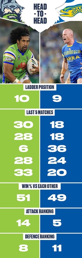The Raiders and the Eels have clashed on 55 occassions and there is almost nothing to split the sides with the Raiders winning 28 matches opposed to 27 wins for the Eels . However, the Raiders have claimed eight wins in the last ten matches between the sides.