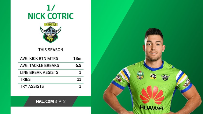 Cotric will be the Raiders' third fullback in four weeks and it will be interesting to see how he goes wearing the number one. He impressed during his only other match at fullback this year where he ran for 142 metres against the Bulldogs and looked dangerous whenever he touched the ball.