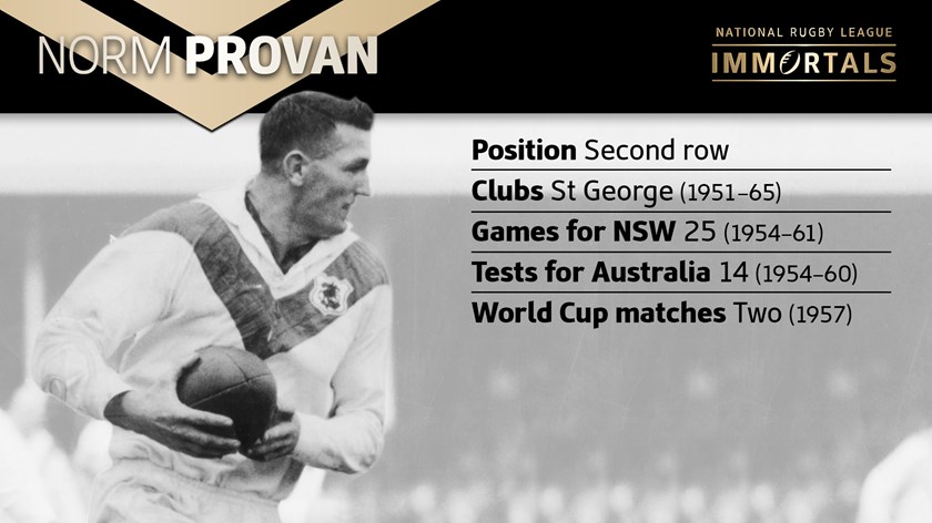 Norm Provan was the backbone of St George's historic run of 11 consecutive premierships between 1956-66, since Provan played in 10 of them – the last five as captain/coach.