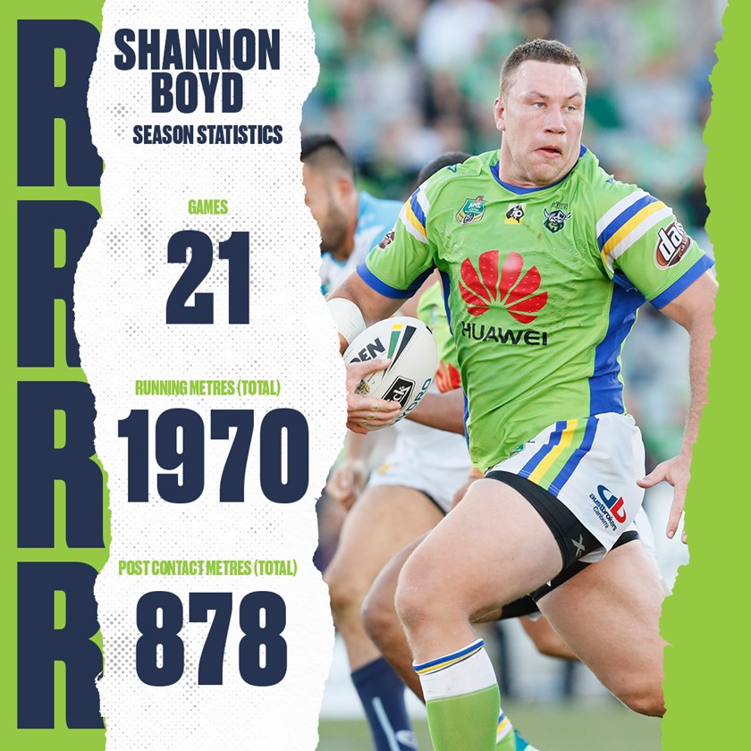 The Raiders' round 23 win against the eventual premiers the Sydney Roosters was another strong showing from Boyd who posted 125 running metres (64 post contact) as well as making 34 tackles during the contest.