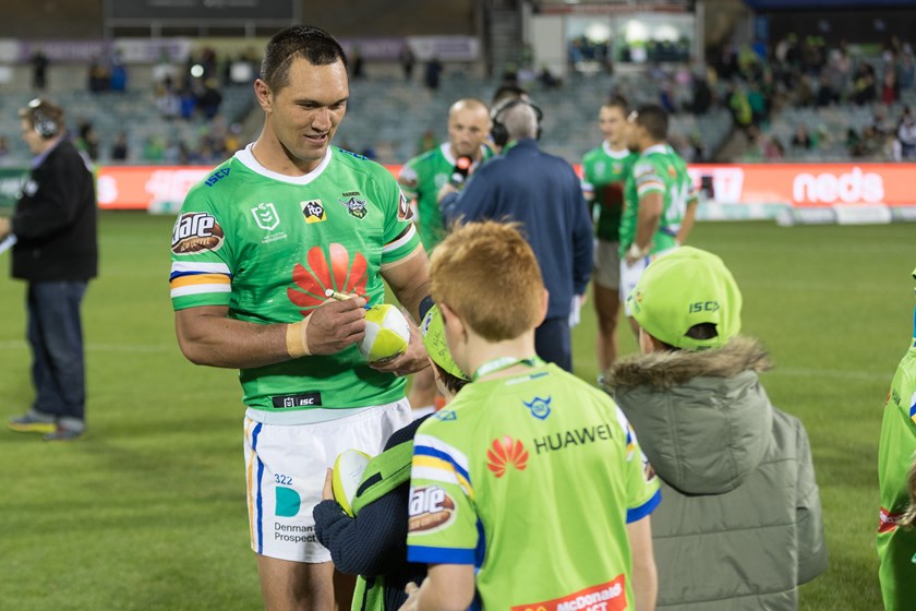 The Junior Member will give each player two Canberra Milk mini-footys to sign, one footy goes to the Junior Member and one will be thrown into the crowd by the Raiders player to thank Members and fans for their attendance.