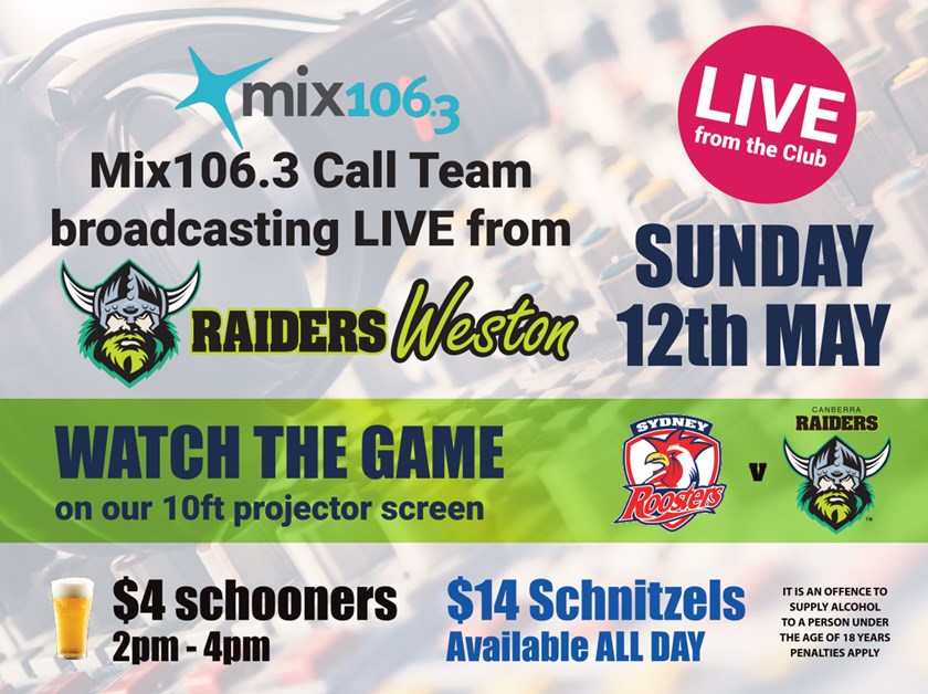 Join fellow Raiders members and fans at Raiders Weston to watch the Raiders take on the Roosters.