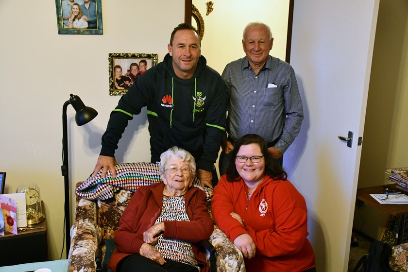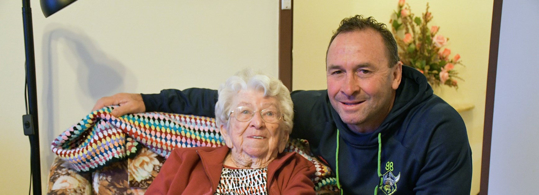 Canberra Raiders Coach Ricky Stuart (Raider #98) made a special trip to the South of Canberra on Monday afternoon, to have a cup of tea with one of the clubs oldest and longest serving supporters Myrtle Kelly.