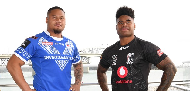 The Toa Samoa team perform the Siva Tau ahead of their clash against Fiji at Eden Park
