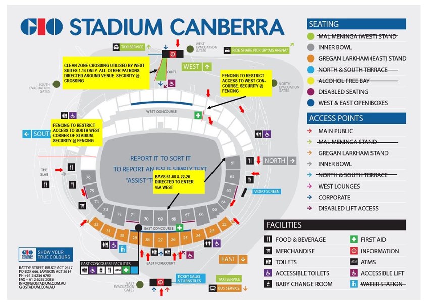 The usual drop off and pick up points at GIO Stadium will apply. Please adhere to 1.5m social distancing when queuing for taxis or rideshare services.