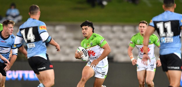 Winger for Sharks is number 2 Nene MacdonaldWinger for Raiders is number 2 Semi Valemei