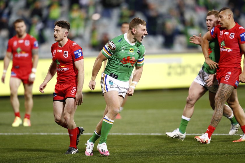 For Frawley, it was his Raiders debut after he’d come through the club’s junior pathways before playing for the Bulldogs and Huddersfield Giants. The five-eighth made sure it was a debut to remember with a try of his own.