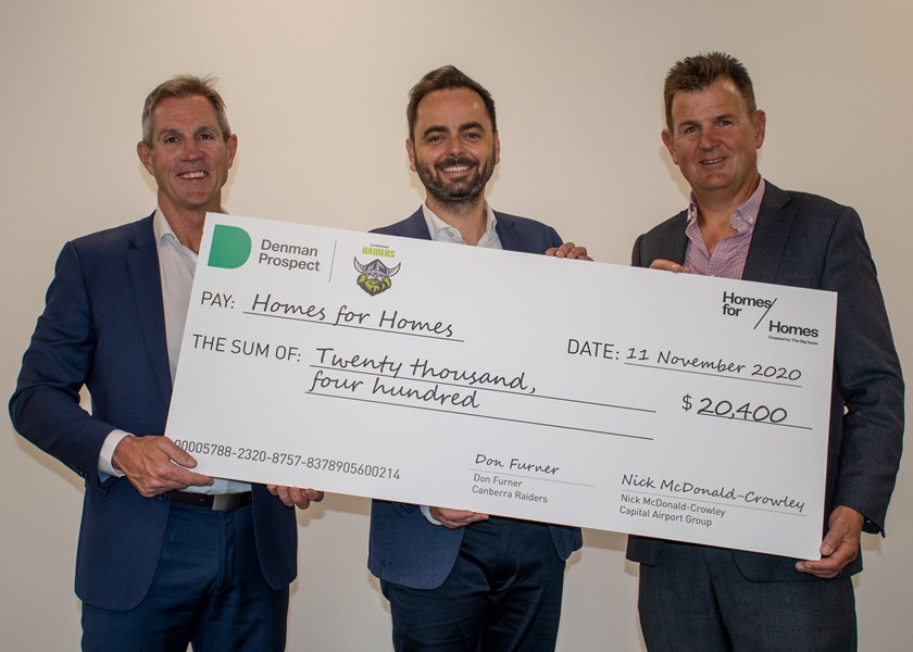 The Canberra Raiders and major partner Denman Prospect have presented Homes for Homes with a $20,400 cheque to aide their mission to end homelessness in Canberra.