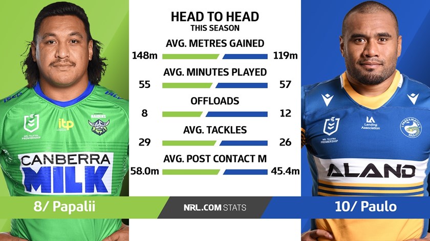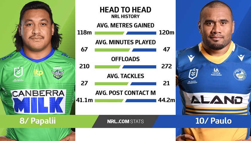 Two of the most intimidating props in the game will clash when Papalii and former Raider, Paulo, battle it out in the centre of the field on Saturday night.