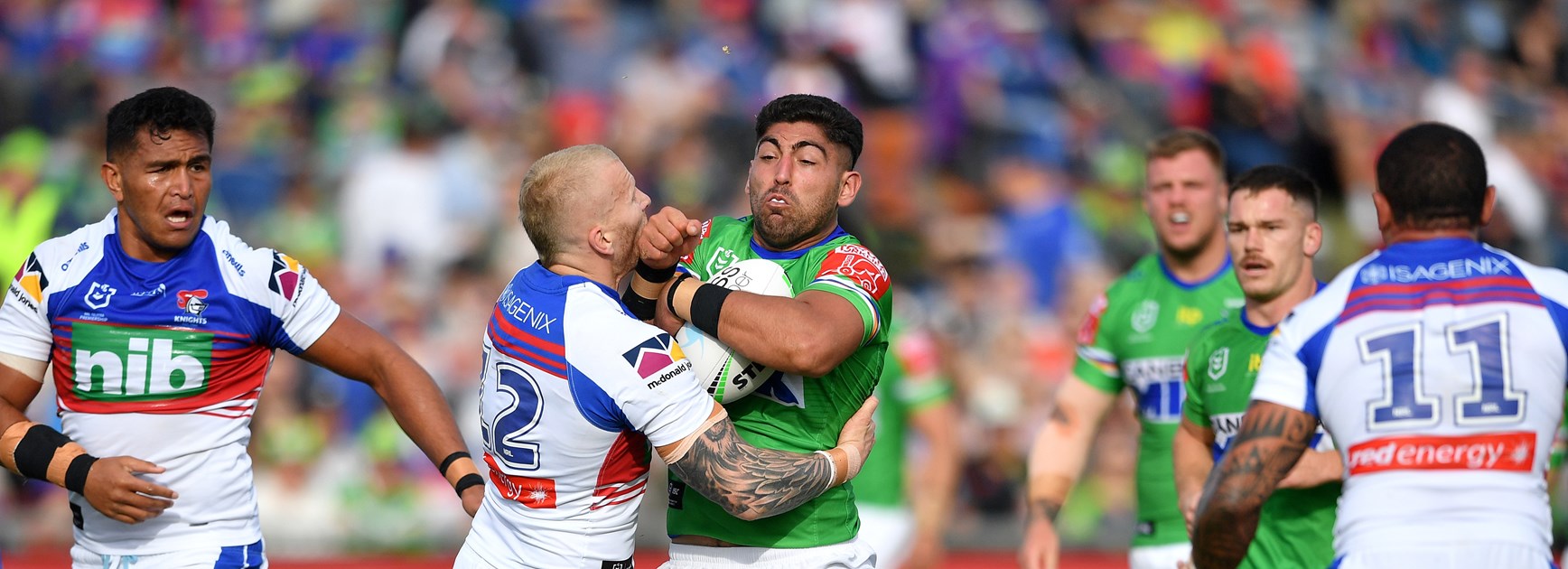 With 12 minutes remaining, the Knights took the lead from the Raiders when Tyson Frizell crashed through the Raiders defence from close range to score.