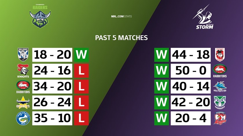 The last time these two sides faced was in the 2020 NRL Preliminary Final where the Storm defeated the Raiders 30-10 at Suncorp Stadium.