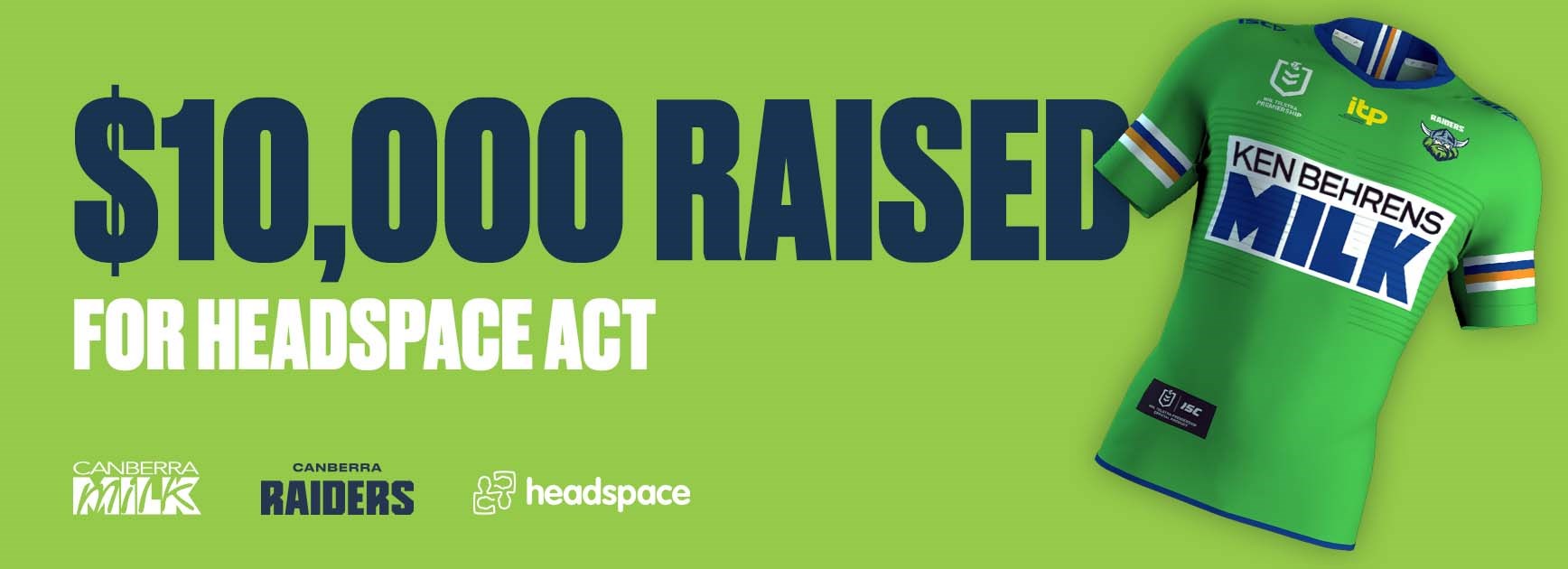 The Canberra Raiders and Canberra Milk have combined to raise $10,000 for headspace Canberra and Tuggeranong, from the production and sale of some limited edition Ken Behrens Milk jerseys.