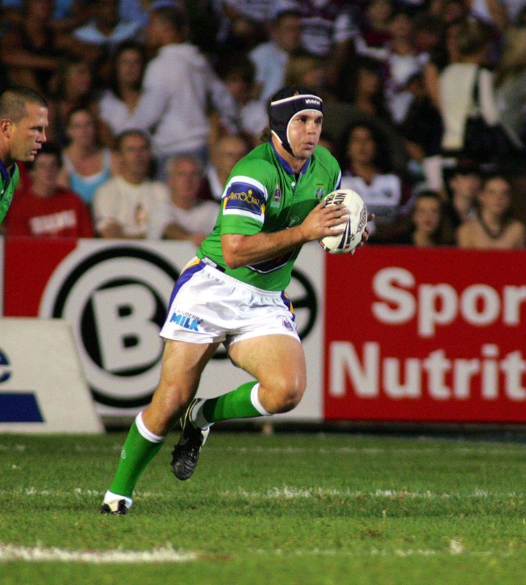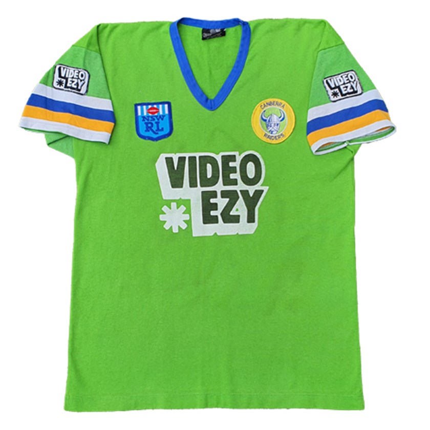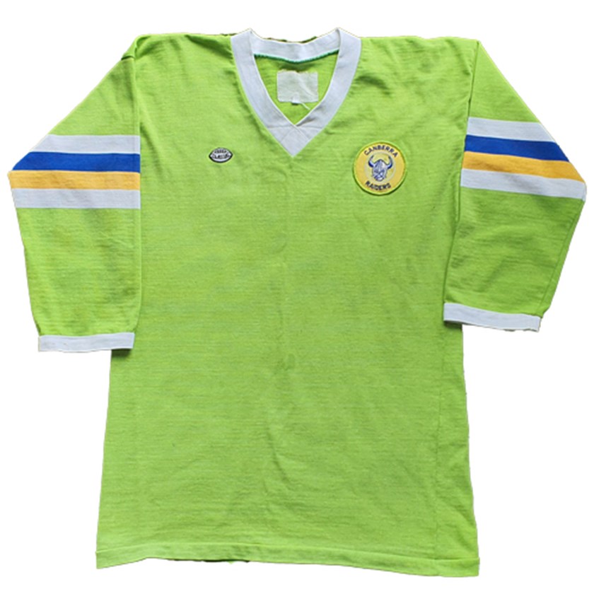In David Headon’s recent book ‘Absolutely Bleeding Green – The Raiders story’ he explains that the competition attracted over 120 entries and was won by local resident ‘Patricia Taylor’. She proposed the colours of the jersey ought to be a combination of the ACT’s blue and gold, together with the green and white of the Hall village rugby league team of yesteryear. The uniform design, approved by the NSWRL in August, consisted of a lime-green jersey with white hoops above the elbows and blue and gold stripes, and lime green socks with banded blue, gold and white tops.
