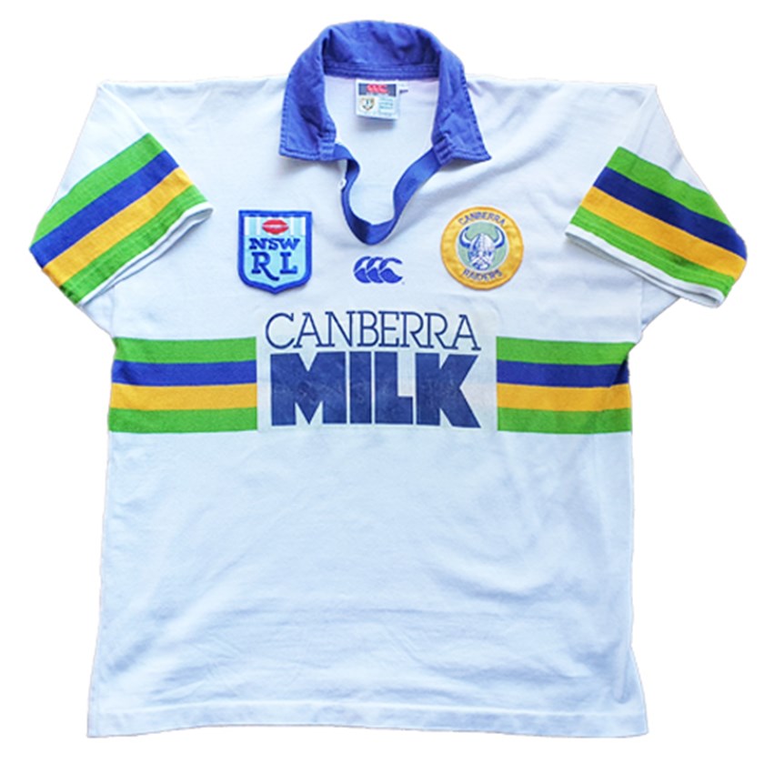 The jersey manufactured by Canterbury, carries the NSWRL logo and the traditional Raiders logo.