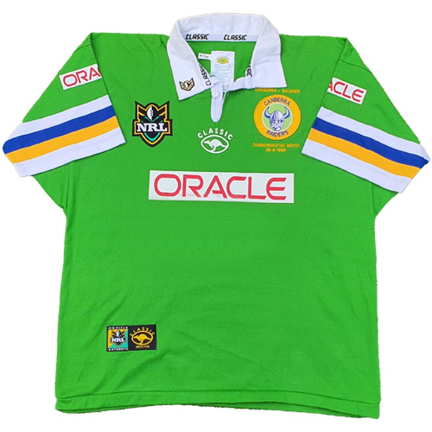 The jersey was produced by classic sportswear and featured match details embroidered above and below the Raiders emblem to help mark the occasion. The NRL logo also featured on this jersey.