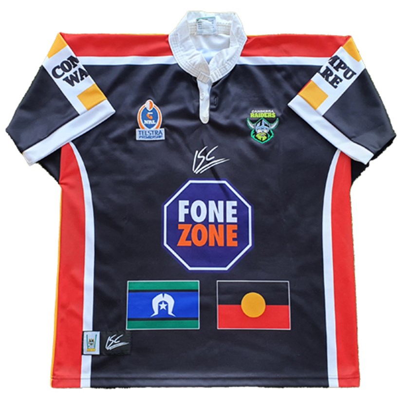 Manufactured by ISC, the jersey carries the Telstra Premiership and Canberra Raiders logos. The clubs major sponsor in 2003 was Fone Zone and their logo appears on the front of the jersey also.