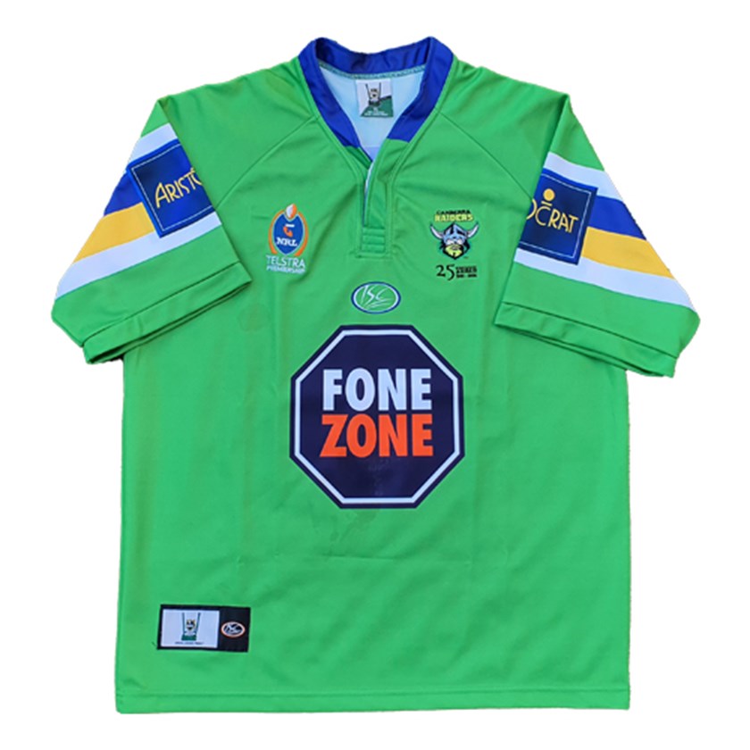 The simple design of a green jersey with the blue, white and yellow hoops on the sleeves with a blue collar gave fans the opportunity to help mark the 25-year milestone with a tribute to the past. The jersey manufactured by ISC featured the Raiders 25-year logo on the chest together with the Telstra Premiership logo and the major sponsor Fone Zone logo.
