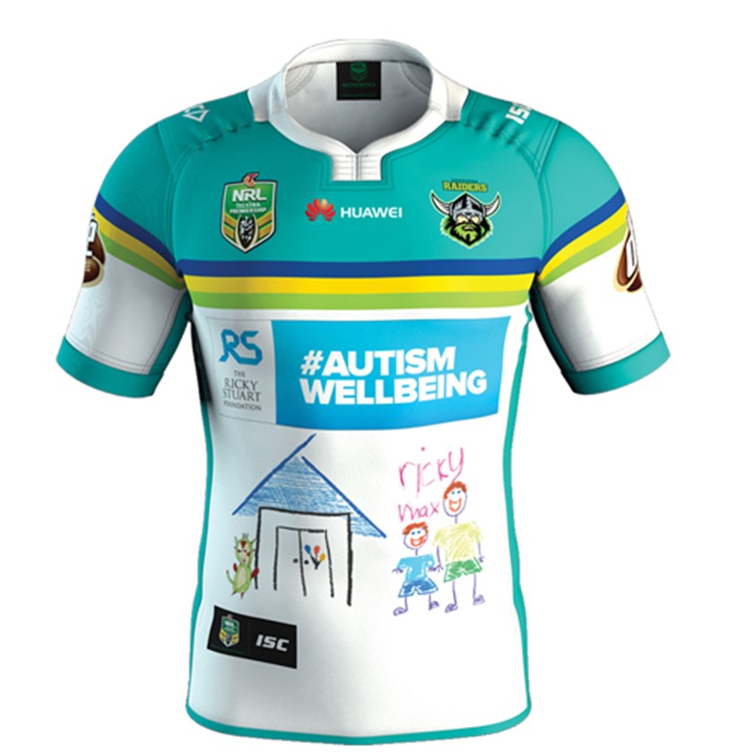 The jersey’s featured artwork from two children Max and Jayden who attended and benefited from the Ricky Stuart House in Canberra, together with the RSF logos and #AutismWellbeing message.