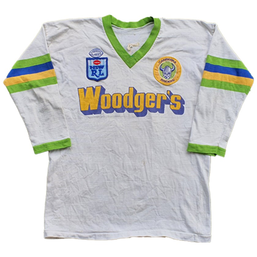 Manufactured by peerless, the jersey also displayed the rare NSWRFL logo which only existed for 3 seasons and original Canberra Raiders logos. The Major sponsor logo, Woodgers was displayed in a yellow and blue font, which was different to the home jersey logo.