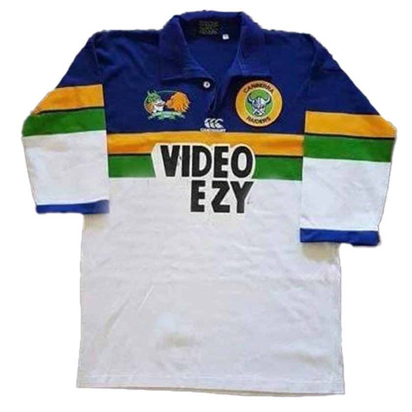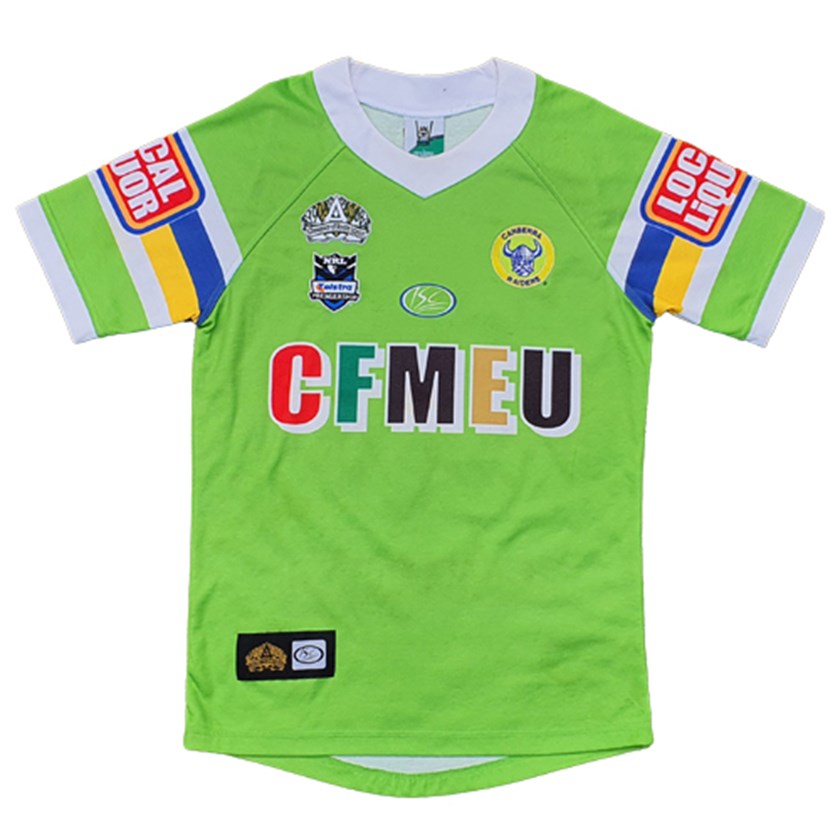 The 1994 Raiders home jersey is another significant jersey in Raider’s history, as it was worn in a premiership season. The Raiders wore this jersey in their 36-12 win over the Bulldogs in the decider, in what was Mal Meninga’s last match for the Green Machine. The iconic image of him celebrating his final try of the decider is now depicted on the Meninga Medal.