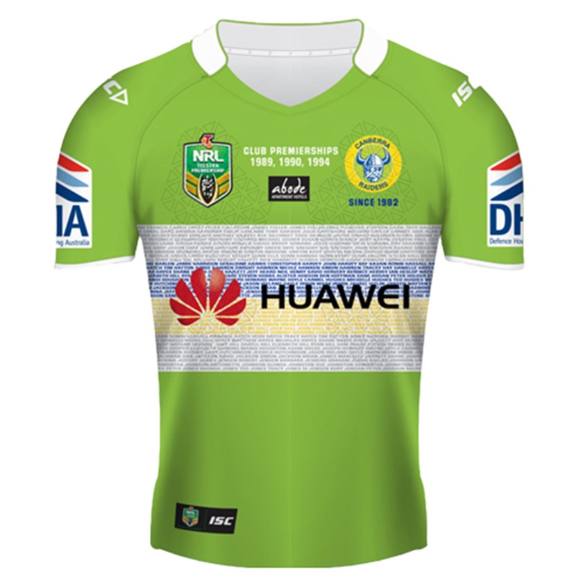The jersey featured the Telstra Premiership and Raiders logos. Major Sponsor Huawei logo along with Defence Housing Australia and Abode Hotels adorned the other sponsorship spaces on the jersey.