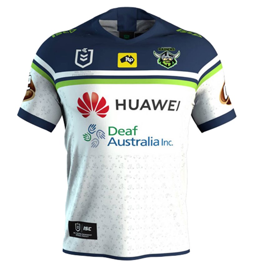 The jersey also carried the Telstra Premiership, Raiders and Major Sponsor Huawei logos as well as sub sponsors ITP, Dare and Austbrokers. The match worn jerseys were auctioned off post-match to raise money for Deaf Australia.