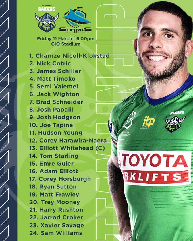 The Canberra Raiders have named their squad for their first match of the season against the Cronulla-Sutherland Sharks at GIO Stadium on Friday night.