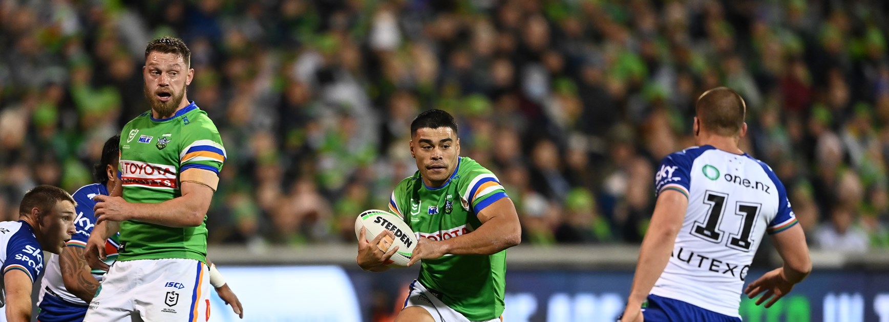 2nd Row for Roosters is number 14 Angus Crichton2nd Row for Raiders is number 12 Elliott Whitehead