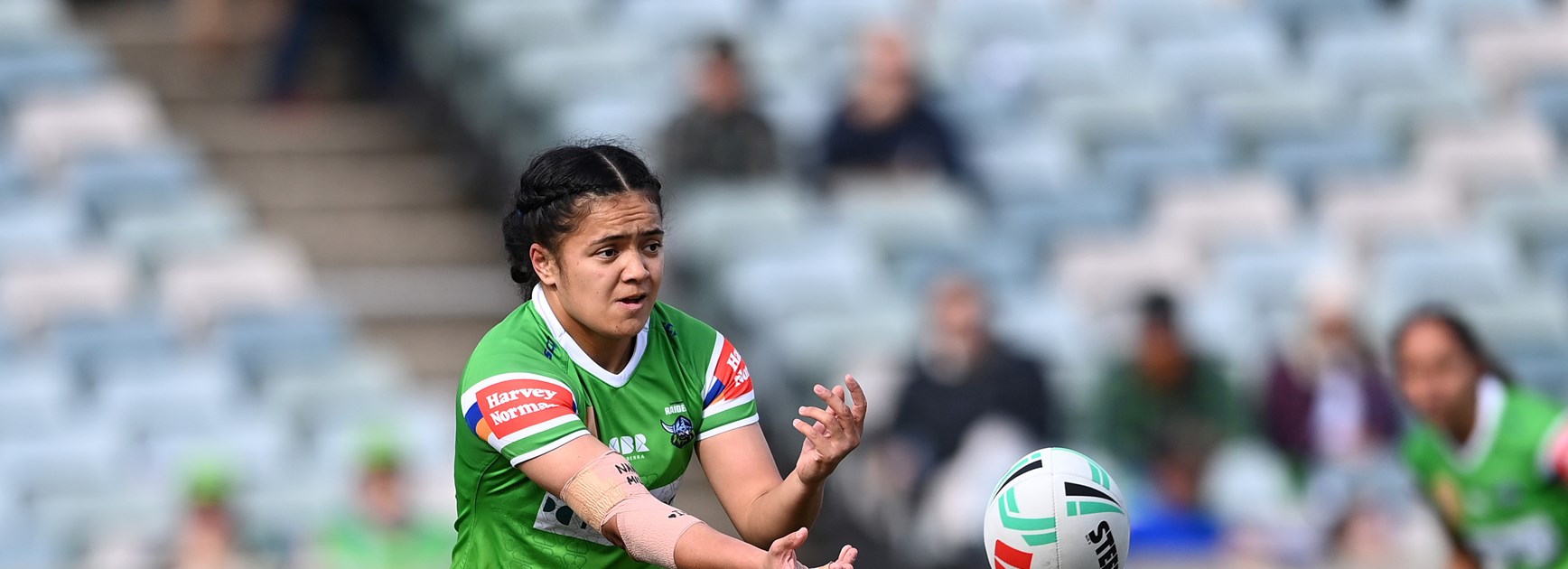 Winger for Raiders is number 2 Madison BartlettWinger for Wests Tigers is number 2 Jakiya Whitfeld