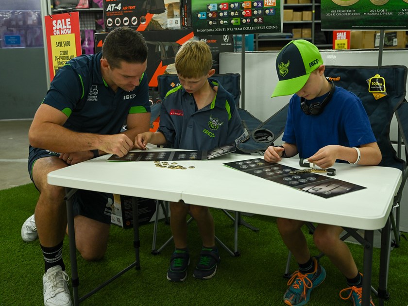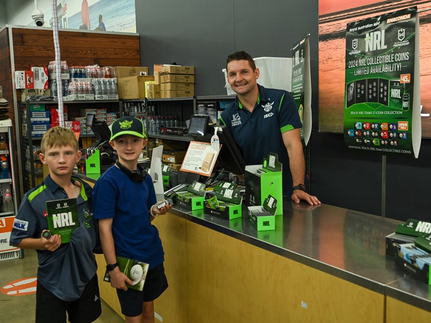 Leslie (10) and Damon (8) ventured into their local Anaconda store before school to purchase their NRL coin sets, only to find former Canberra Raiders captain Jarrod Croker behind the counter waiting to serve them.