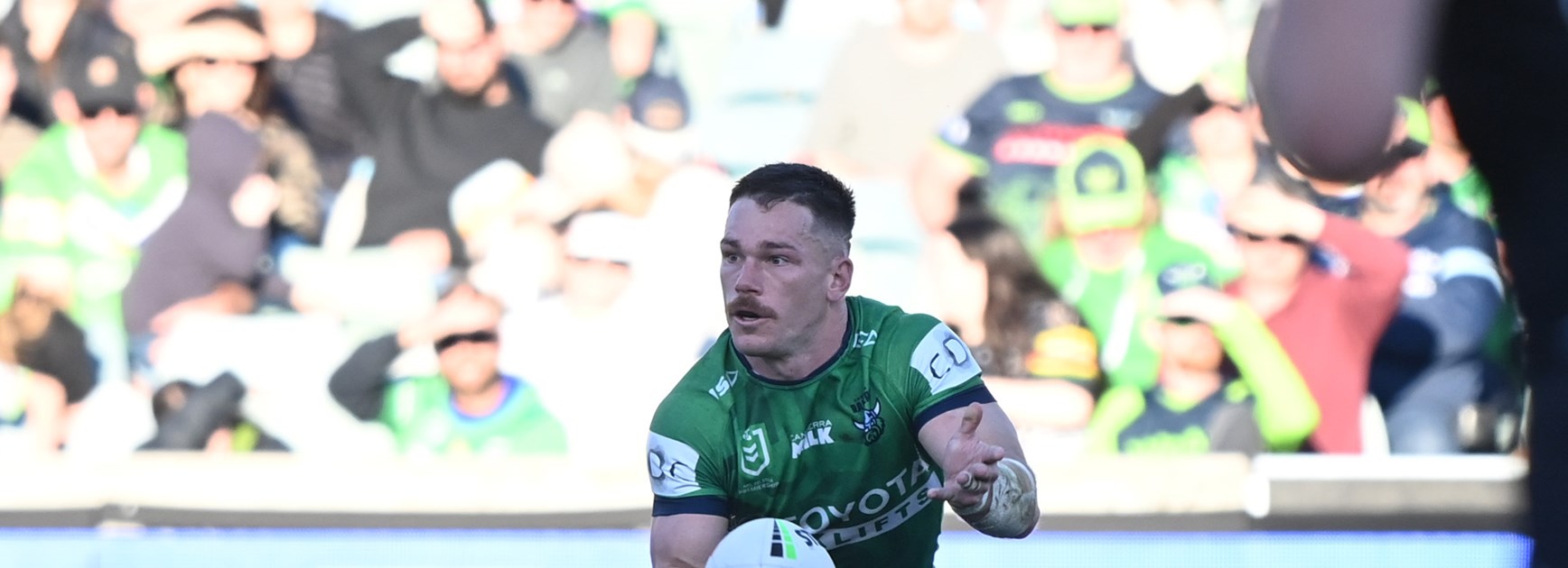 Winger for Roosters is number 5 Dominic YoungWinger for Raiders is number 5 Xavier Savage