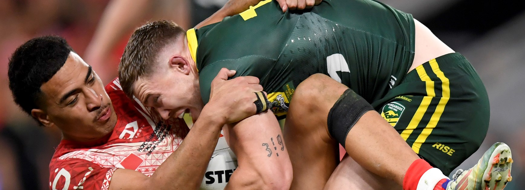 Winger for Kiwis is number 2 Jamayne IsaakoWinger for Kangaroos is number 2 Xavier Coates
