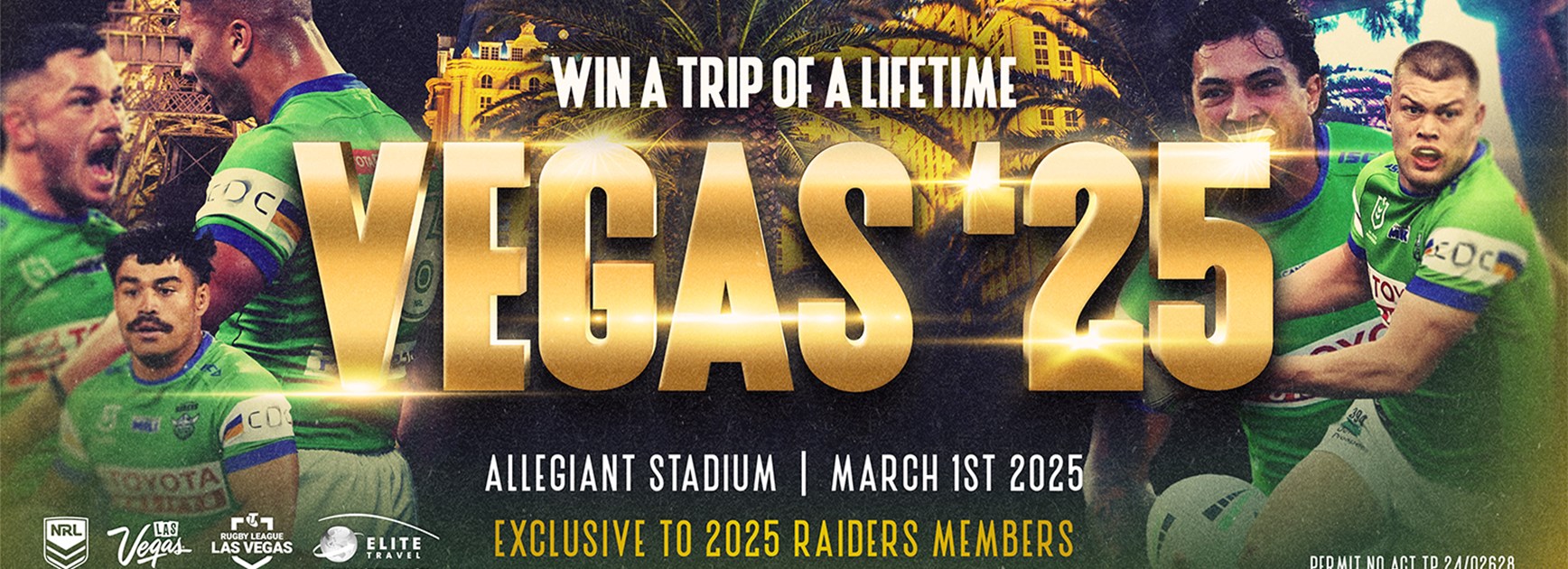 Thanks to Elite Travel, anyone who renews or signs up to become a Canberra Raiders member for the 2025 season* automatically goes into the draw to win an awesome travel package to be there for the season opener at Allegiant Stadium.