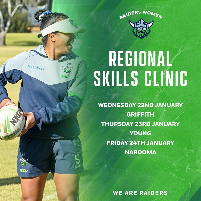 The Canberra Raiders will run a series of skills clinics in regional New South Wales in January 2025 for junior girls and women’s age groups.