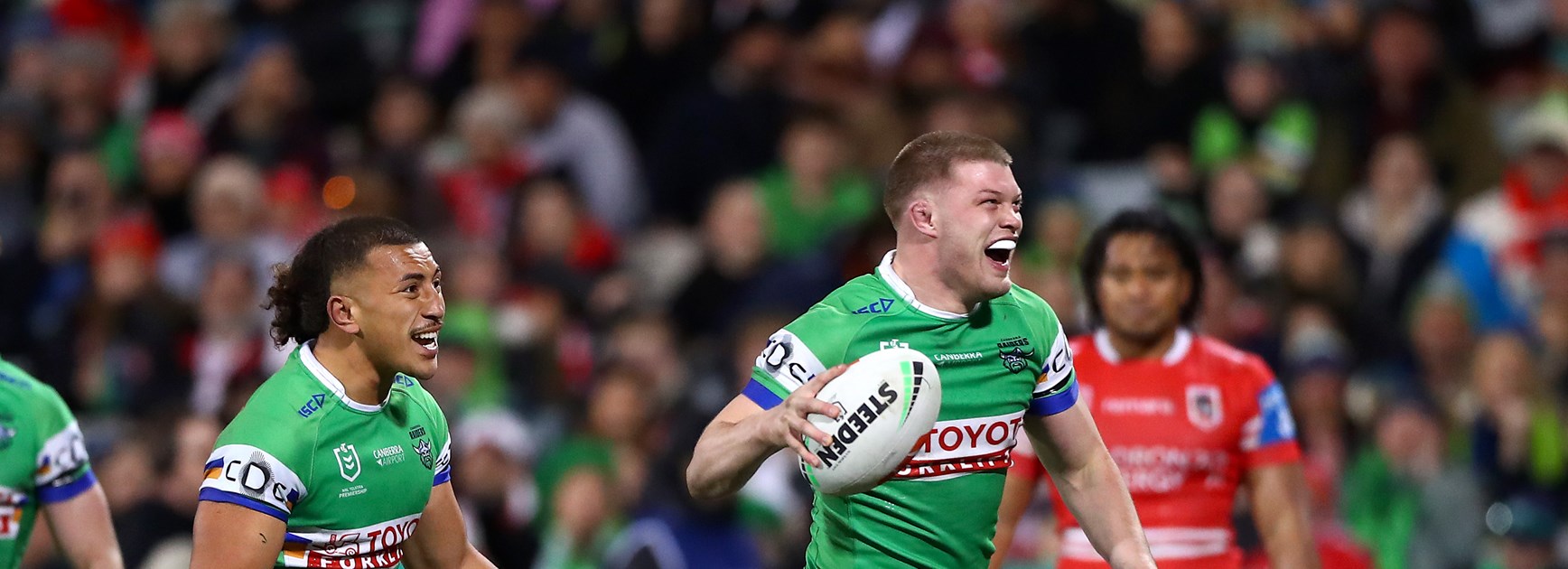 But with two minutes to go, Weekes lit GIO Stadium on fire, running 90 metres up the right edge to score off the back of a misfired Dragons kick. Fogarty added the extras to put the Raiders ahead 12-6 as they headed into the sheds.