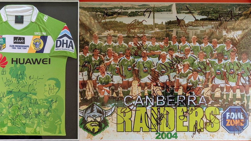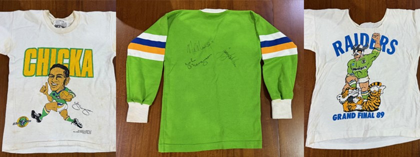 Hamish also still has his kids shirts from the 1989 grand final. The Raiders jersey was signed by Chicka, Mal and Gary Belcher. The one with Victor standing over the tiger was bought directly after the game in Sydney - some enterprising people. The third celebrates Chicka.